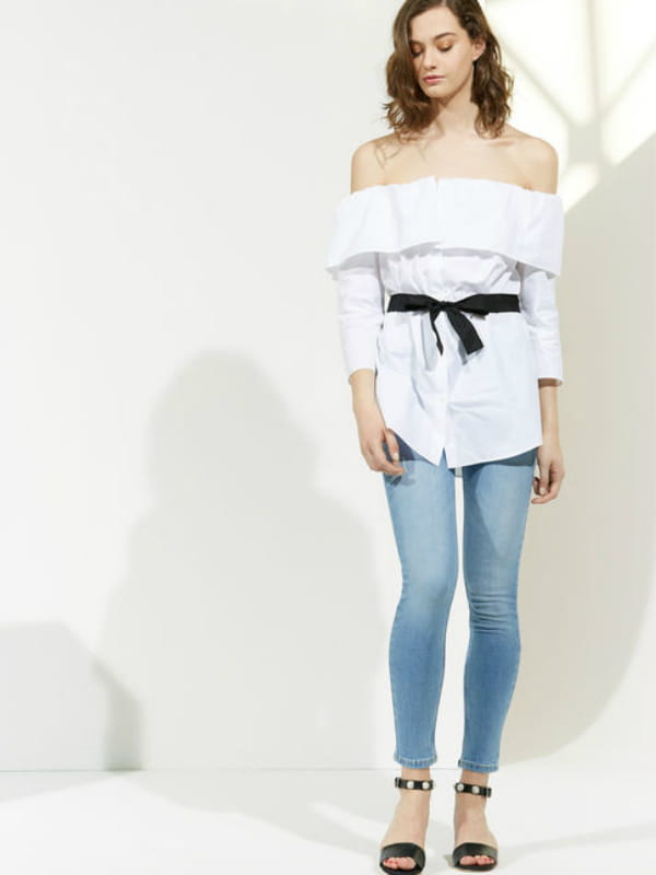 Chemise blanche à encolure Bardot et ruban noir de Claudie Pierlot