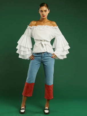 Haut blanc à volants, manches XXL et ceinture à la taille de Jour/Né