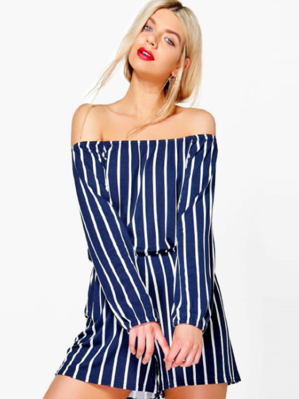 Combinaison short à encolure Bardot et rayures bleues et blanches de Boohoo