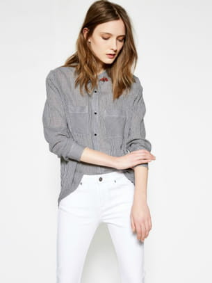 Chemise en vichy noir et blanc et broche bijou sur le col de The Kooples