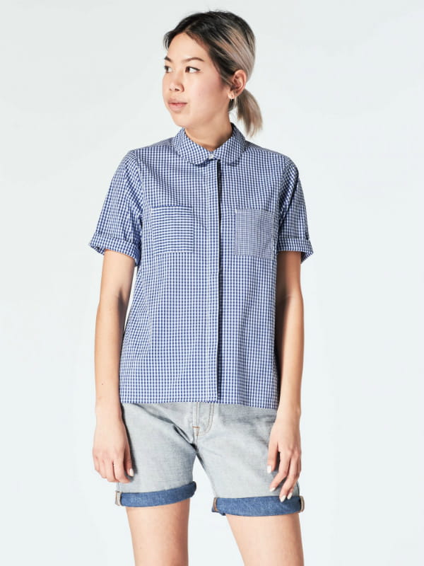 Chemisette en vichy bleu et blanc et poches contrastées de Les Expatriés