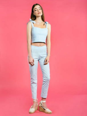 Haut à bretelles nouées en vichy bleu ciel et blanc de Cult Gaia