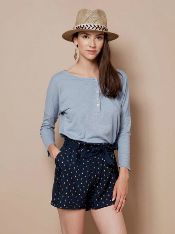 Short bleu foncé à motifs dorés et noué à la taille de Blune