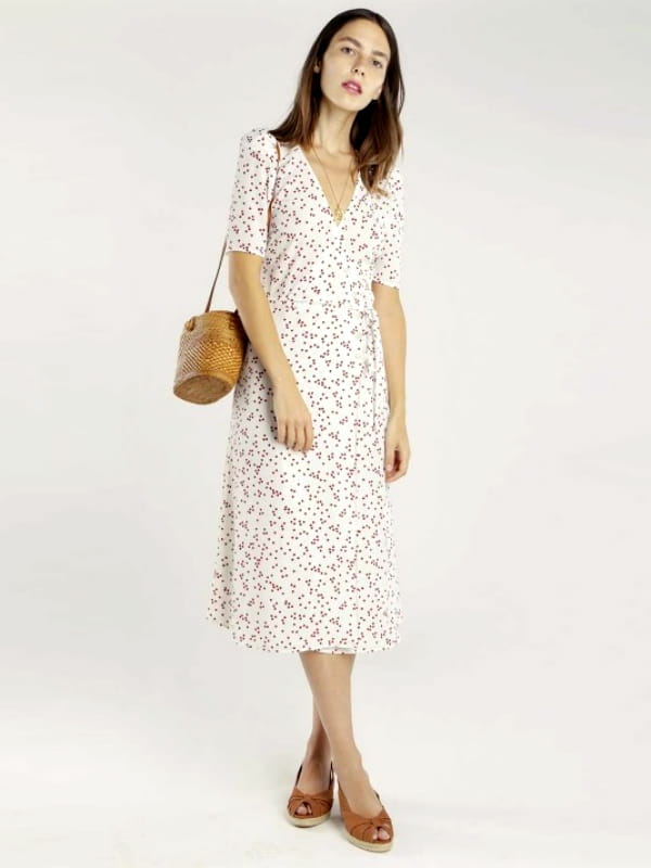 Robe mi-longue blanche imprimée pois rouges à boutons et col V de Rouje