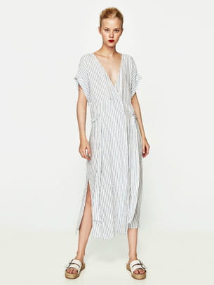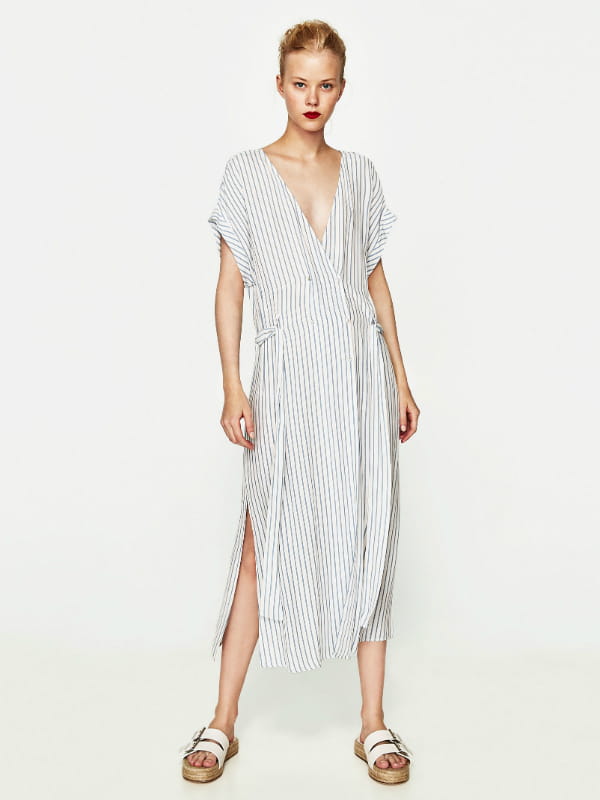 Robe boutonnée col V profond et ceinture blanche à fines rayures bleues de Zara