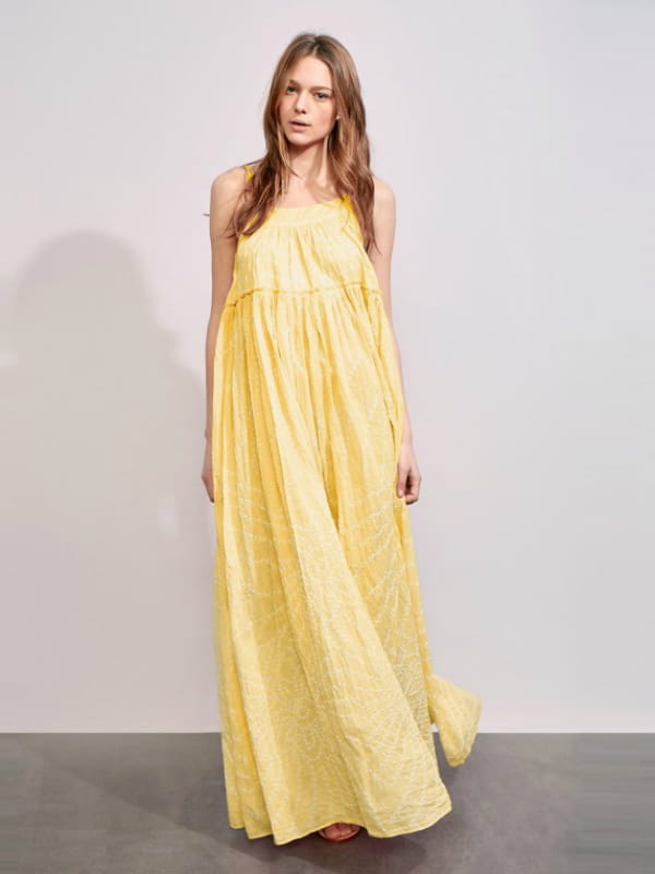 Robe longue jaune style bohème à broderies blanches d'Antik Batik