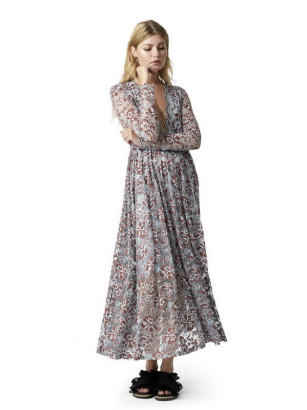 Robe longue en dentelle bleue et bordeaux à décolleté de Ganni