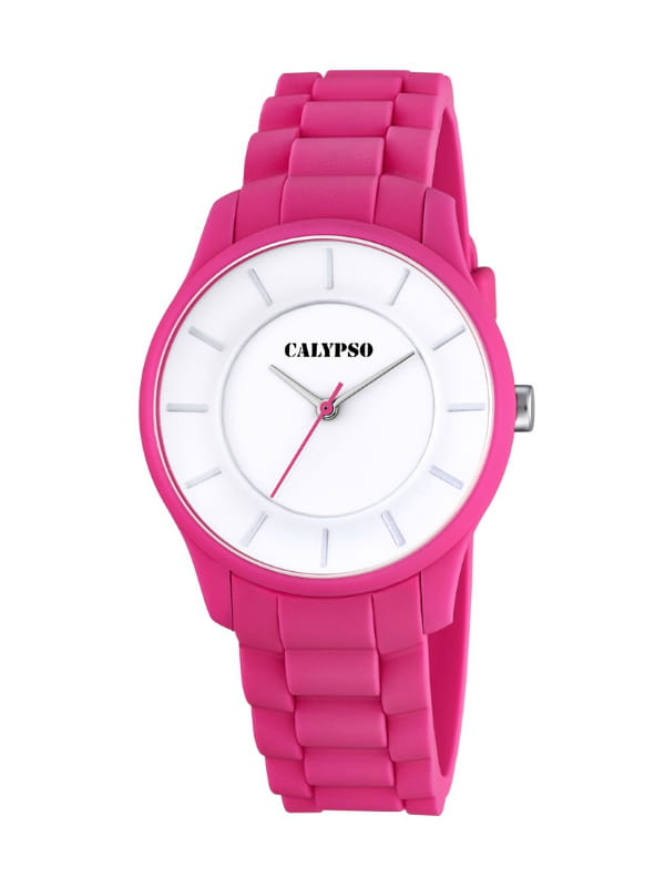 Montre ronde avec bracelet en plastique fuchsia et cadran blanc de Calypso