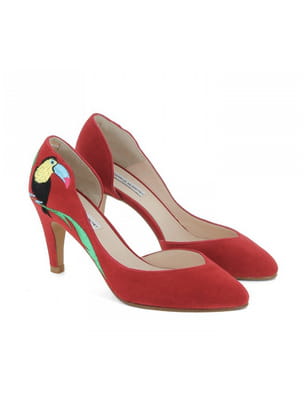 Escarpins en nubuck rouge, décolleté sur le pied, broderies végétales et toucan sur le talon et le quartier de Patricia Blanchet