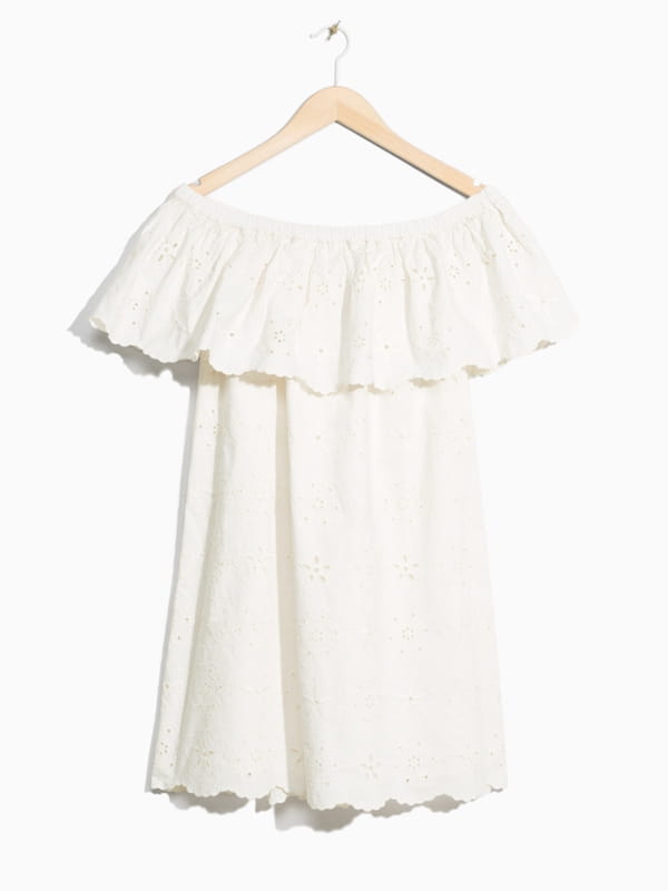 Robe en dentelle anglaise, 100% coton, épaules nues et grand volant sur la poitrine de & Other Stories