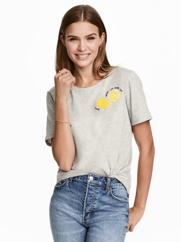 T-shirt gris brodé de citrons "When life gobes you lemons" de H&M