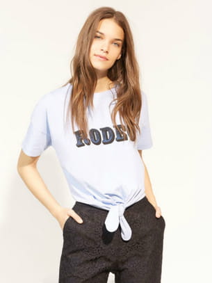 T-shirt bleu imprimé et noué à l'avant de Claudie Pierlot