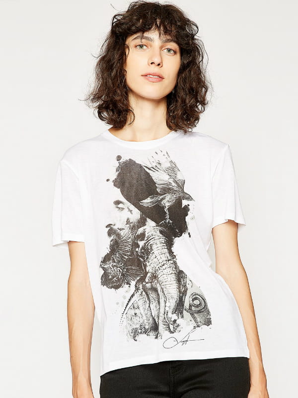 T-shirt blanc imprimé d'une sérigraphie représentant Waris Ahluwalia et Tara, le premier éléphant sauvé par l'association Elephant Family