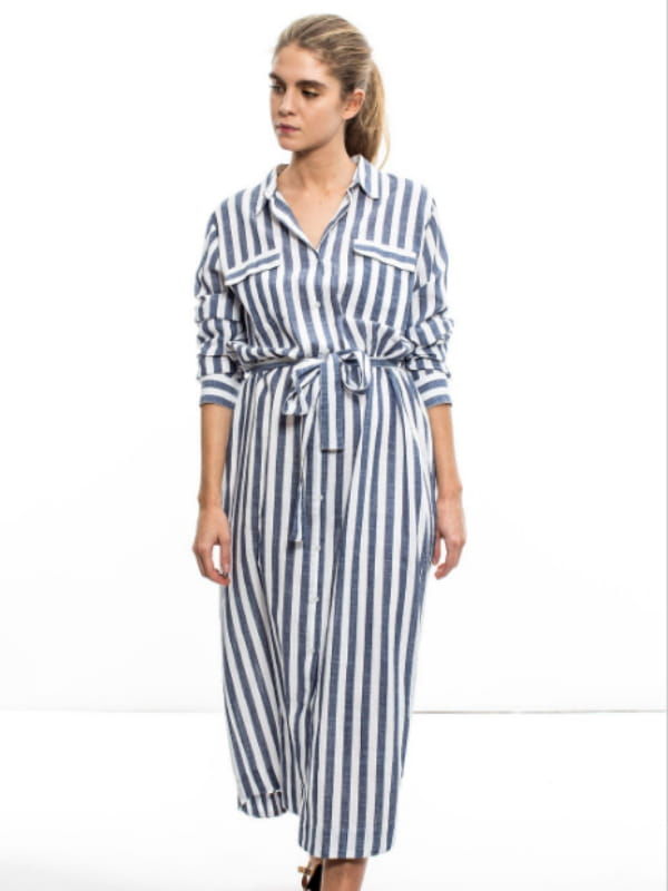 Robe chemise à rayures bleues et blanches et nouée à la taille de Karl Marc John