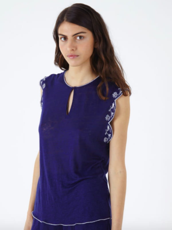 Chemise bleue en lin avec finitions brodées de Marie Sixtine