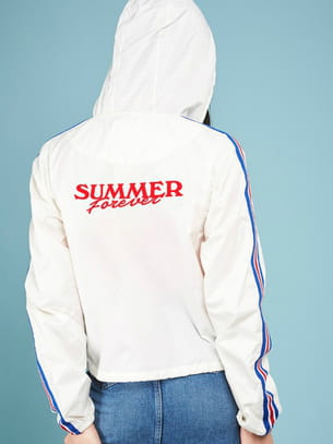 Coupe-vent blanc en tissu imperméable avec bandes tricolores et capuche de Rad