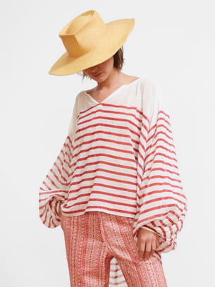 Blouse blanche en gaze de coton à rayures rouges avec manches bouffantes de Mes Demoiselles