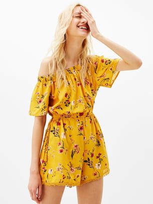 Combinaison short jaune à imprimé floral avec encolure Bardot de Bershka