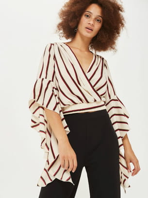 Top décolleté en V manches longues rayé beige noir et rouge de Topshop