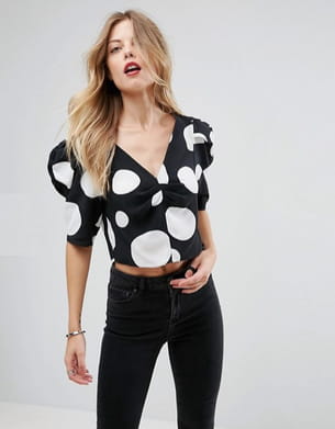 Top noir à gros pois blanc décolleté plongeant et manches courtes ballon de Asos