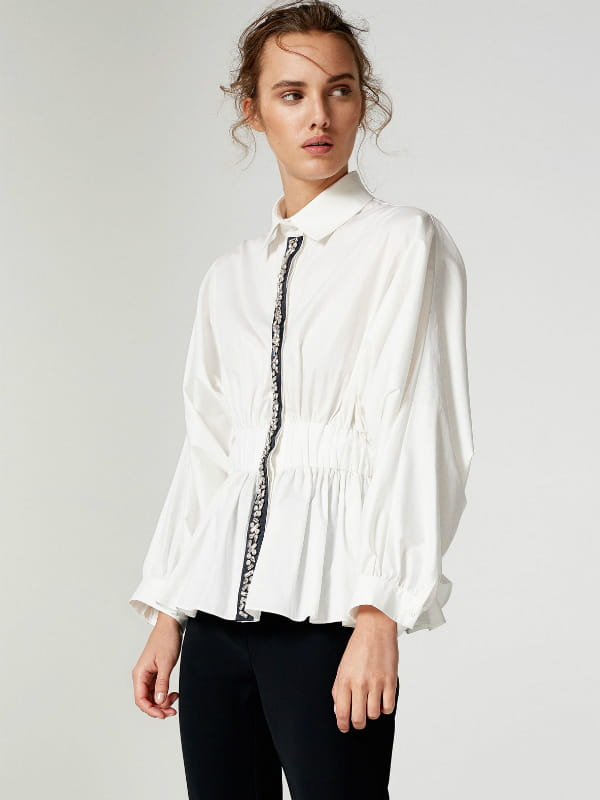 Chemise blanche en popeline de coton à manches chauve souris avec bande de bijoux sur le devant de Uterqüe