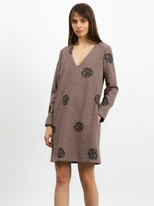 Robe pull courtecol V en maille à motif pied de poule et  fleurs de Paul & Joe.