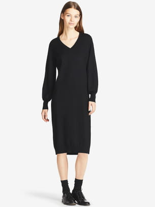 Robe noire en laine de mérinos mélangée, coupe casual avec encolure en V de Uniqlo