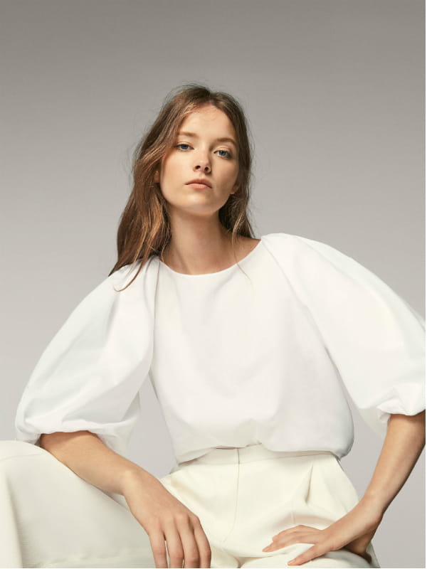 Chemisier blanc en popeline de coton à manches ballon et col semi-bateau de Massimo Dutti