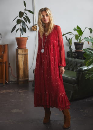 Robe longue à manches longues esprit folk couleur rouge brique de Sézane