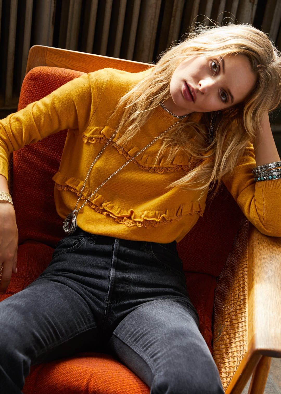 Pull "Andréas" en laine et cachemire jaune safran avec volants en dentelle de Sézane