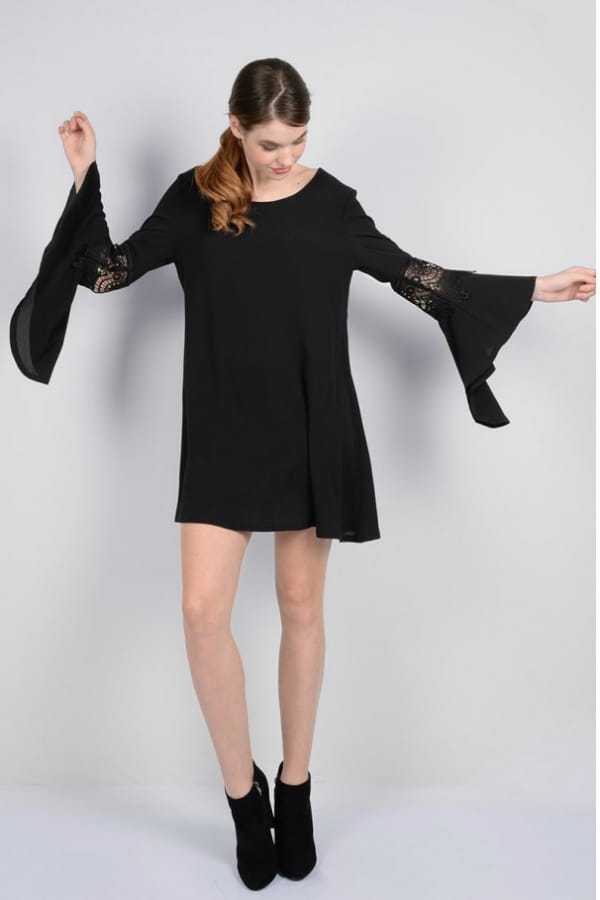 Robe courte noire à manches longues et asymétriques avec détails de dentelle de Molly Bracken
