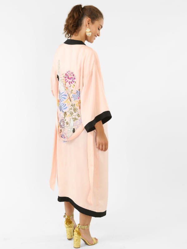 Kimono rose satiné avec broderies florales et perles dans le dos et sur le devant de Pimkie