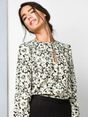 Blouse en viscose à imprimé floral et volants aux épaules avec ouverture en goutte à l'avant