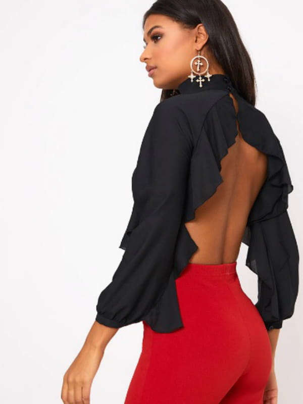 Chemisier noir en polyester à volants avec ouverture dans le dos de Pretty Little Thing