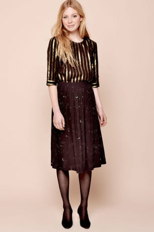 Blouse rayée en lurex noire et dore et jupe midi noir imprimé toiles de Des Petits Hauts