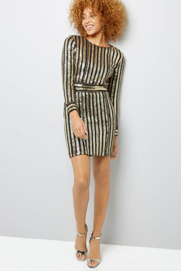 Robe courte à manches longues en sequins dorée et noire de New Look