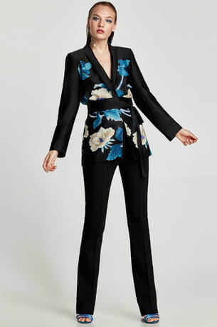 Veste ceinturée en satin à fleurs bleue et noire de Zara