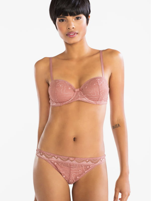 Parure de lingerie composée d'un soutien-gorge paddé et d'un string en dentelle couleur rose foncé poudré de C&A