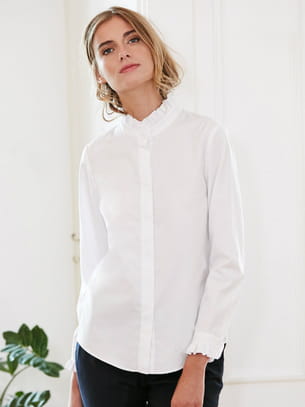 Chemise blanche en coton avec volants au niveau du col et des manches de Claudie Pierlot en exclusivité sur le e-shop