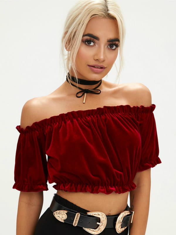 Haut court avec encolure Bardot en velours rouge foncé de Prettylittlething