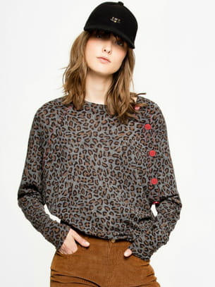 Top à manches longues avec imprimé léopard et patte de boutonnage à l'épaule 100% cachemire plume de Zadig et Voltaire