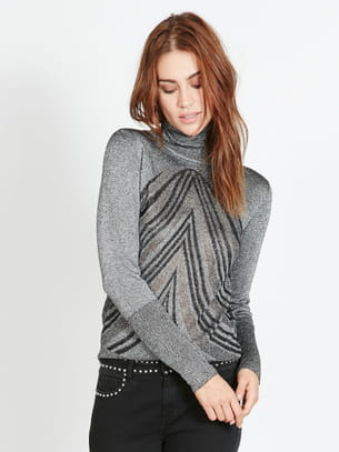 Top à manches longues gris en lurex avec motifs chevrons fantaisie et col roulé de Bérénice