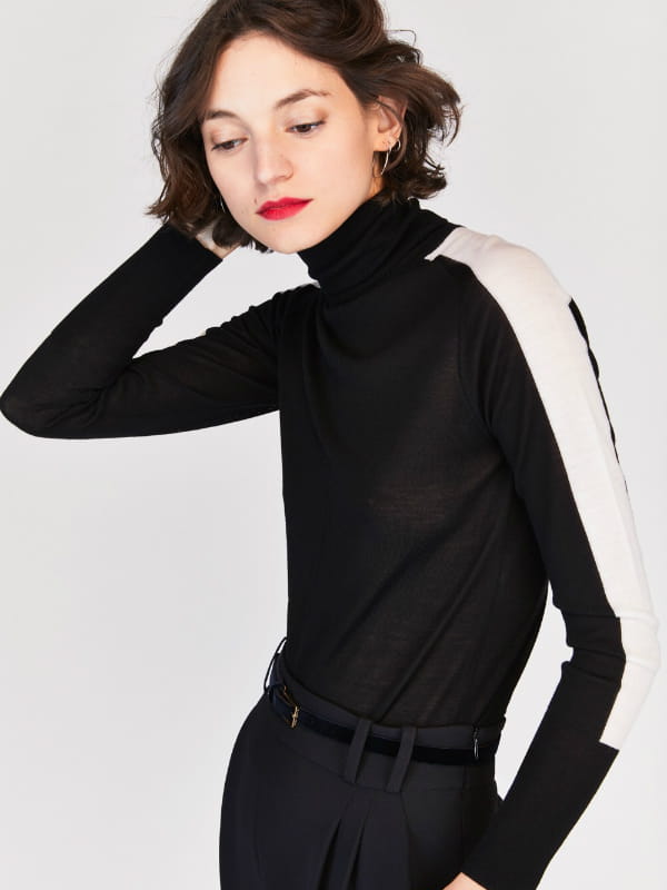 Top noir à manches longues en maille mérinos avec bandes blanches de Tara Jarmon