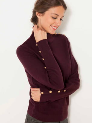 Chandail à col roulé bordeaux avec boutons dorés au niveau des manches et des épaules de Camaïeu