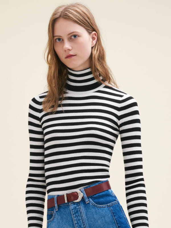 Marinière à manches longues en maille légère avec col roulé et coupe ajustée de Maje