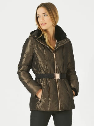 Doudoune cintrée en coloris kaki irisé avec doublure en fausse fourrure, poches zippées et ceinture de 1.2.3