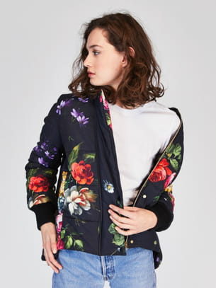 Doudoune courte bleu marine avec imprimé floral original et col montant de Tara Jarmon