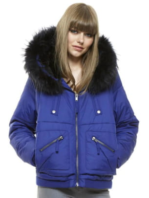 Doudoune bleu glacier courte avec capuche en vraie fourrure et nombreuses poches zippées de Belair