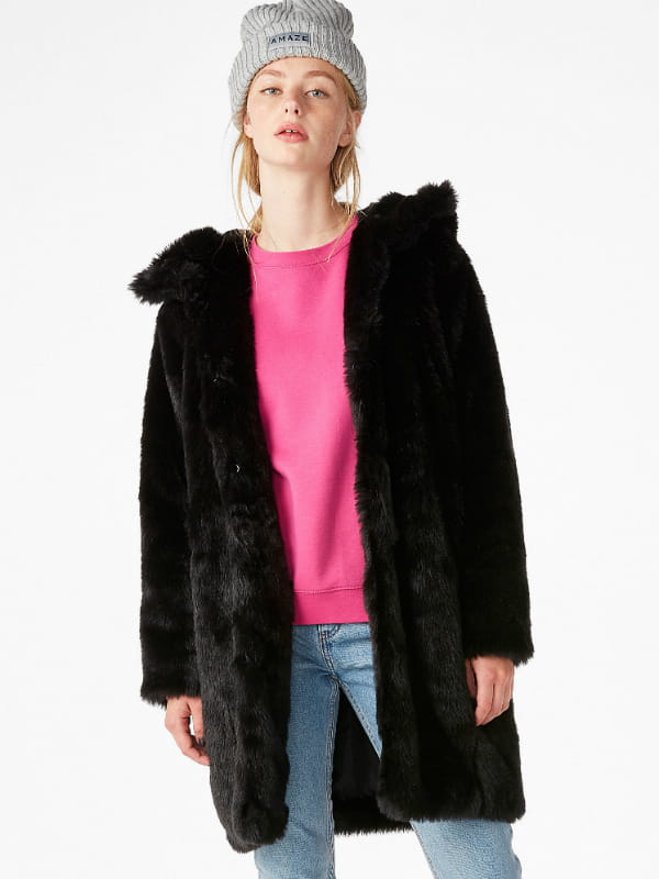 Manteau mi-long à capuche en fausse fourrure en coloris noir de Monki