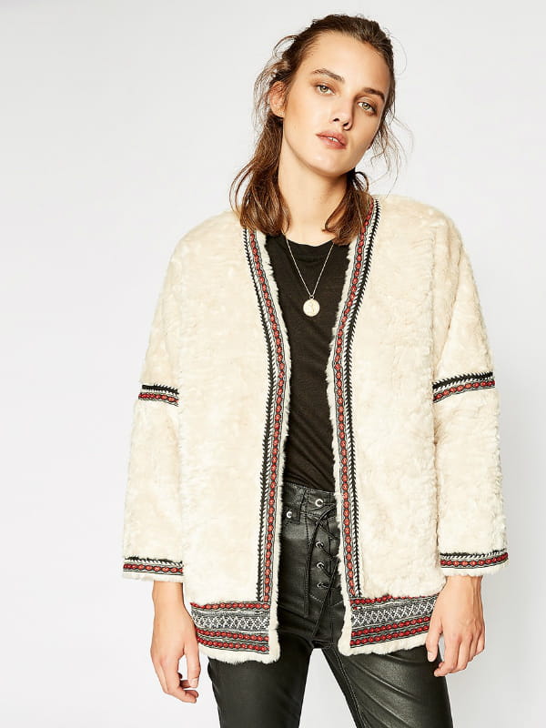 Manteau court brodé en fausse fourrure en coloris écru de The Kooples